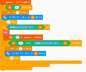 二人で「端に行くのは絶対やろ。だから途中でブロックを見つけたら端に行くまでまた繰返しでいいがやない?」「1個でも見つけたら次のブロック見つけるまで端に動かすがやろ」と言いあいながらもポイントは抑えられていた為二人の考えをまとめる形で先生がサンプルを出します。(残り時間の関係で)
